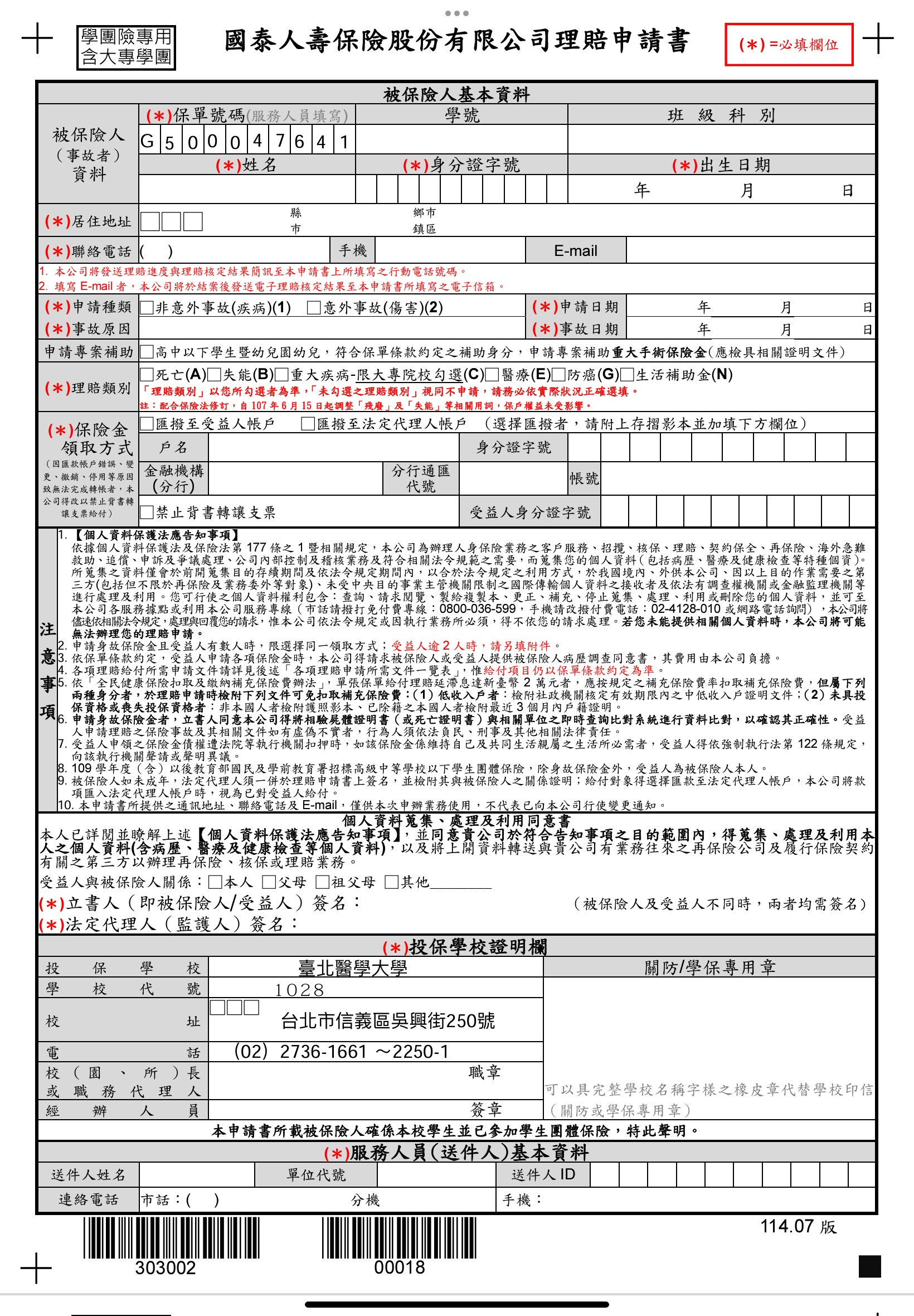 衛保組-表單下載臺北醫學大學學保理賠申請書(國泰人壽)